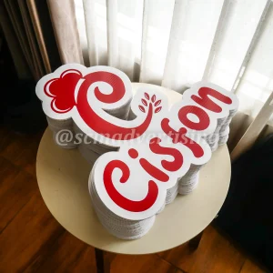 Dibuat dari bahan tahan cuaca seperti akrilik, besi, neon box, bahkan kayu