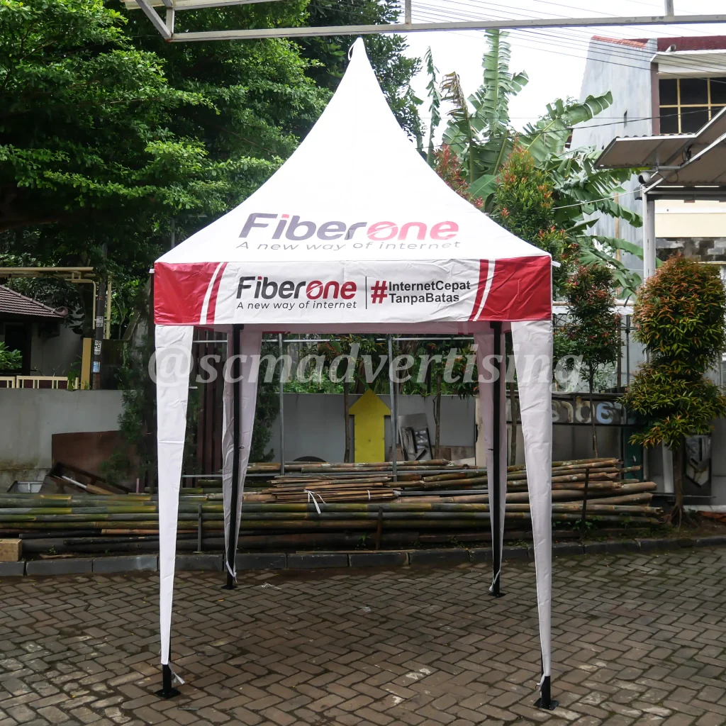 Tenda stand kerucut Jogja punya client kita Fiberone. Dengan ukuran 2 x 2 meter, tenda branding kerucut Jogja milik client kita ini cukup memudahkan client untuk pemasangannya. Penasaran nggak kalo kita ada di bawah tenda, kalo ndangak keliatan apanya? Besinya, bener.